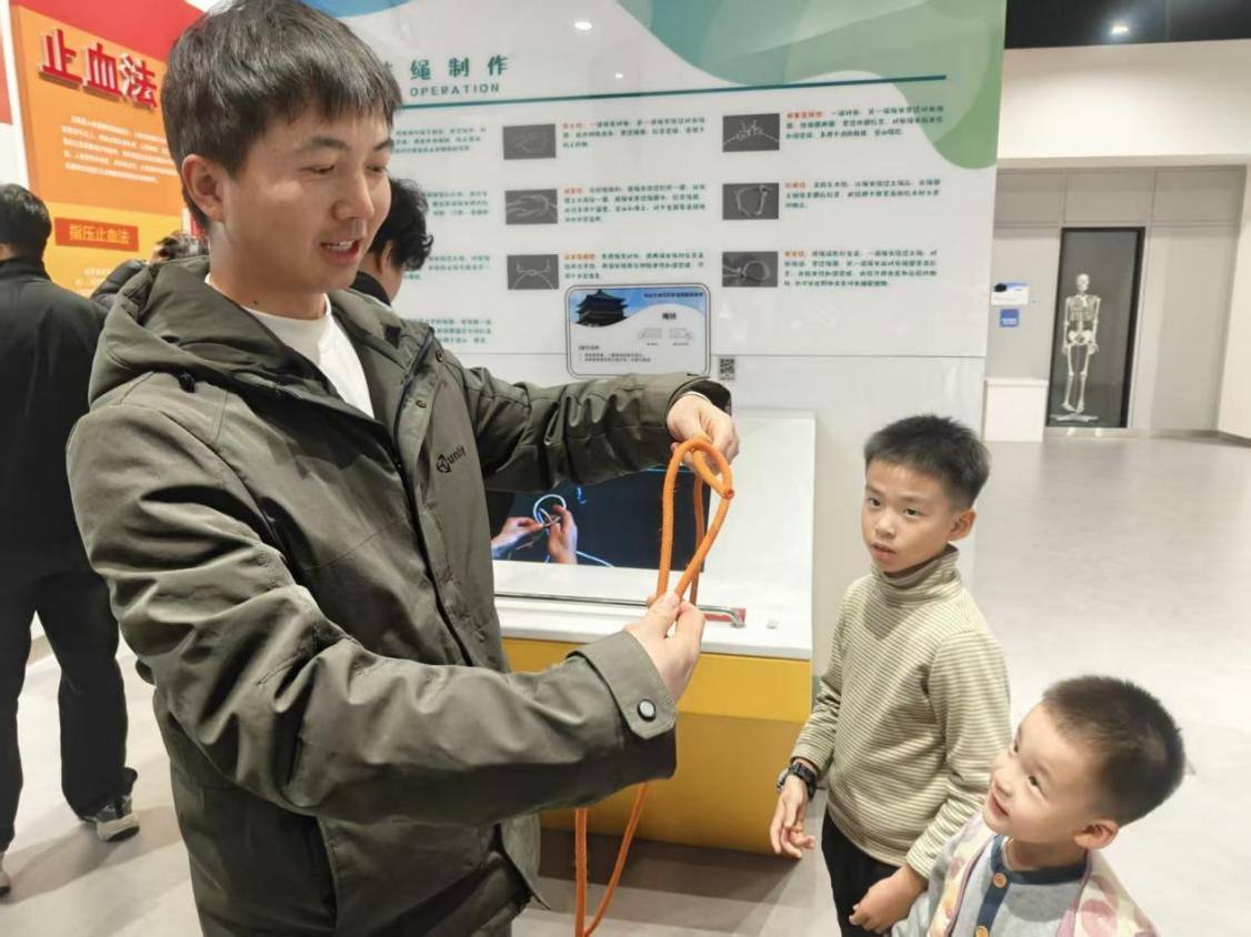 活动期间,党支部书记充分发挥先锋模范作用,在应急绳结教学区现场示范讲解逃生绳结打法,对单结、八字结、布林结等常用绳结的操作技巧逐一拆解,并耐心解答党员的疑问,现场还吸引了青少年观众驻足学习,形成党群互动的良好氛围。