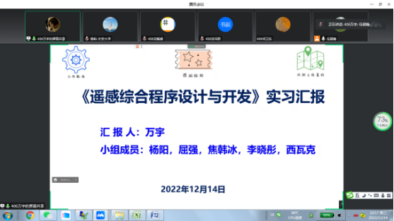 2022年12月14日上午9:00-12:00,测绘科学系遥感教研室通过腾讯会议召开了2020版遥感科学与技术专业培养方案《遥感综合程序设计与开发》课程学生实习汇报及线上建设研讨论会。此次会议的目的是通过实习汇报、教师之间的讨论,学生意见的反馈来调整和优化教学内容、改进教学方式,加强学生学习过程管理、以及检验学生实践效果,进一步完善课程大纲的各项内容,实现本课程的持续改进。会议由任超锋老师主持,杨耘、彭晓东、席江波、丛铭等多名课程建设团队成员参加。
