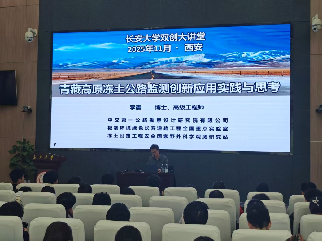 李震博士作为极端环境绿色长寿道路工程全国重点实验室、冻土公路工程安全国家野外科学观测研究站的监测方向学术带头人,长期致力于公路工程智能监测预警研究。讲座伊始,他系统阐述了全球冻土的分布特征及其对生态、气候和工程建设的深远影响,并指出我国青藏高原及西部高山地区近180万平方千米的高海拔冻土对公路工程建设与运维提出的重大挑战。他提到,中交集团及中交一公院通过三代人50年的技术积累,构建了“两廊三场”观测研究体系,为我国冻土公路工程创新奠定了坚实基础。